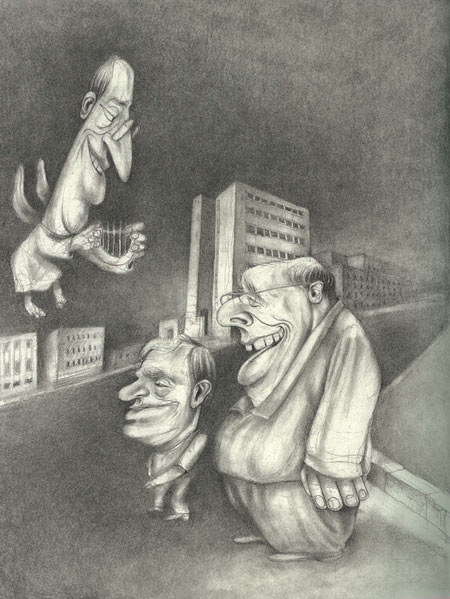 كنتُ في التاسعة والعشرين من عمري آنذاك. جلستُ مساءً في غرفتي المستأجرة بحي نحلاؤوت في القدس، منهمكًا في إعداد مشروع تخرجي من أكاديمية بتسلئيل. كانت الرسومات وجوهًا كاريكاتورية لسياسيين. رسمتُ شلوميت ألوني، وفكرتُ في أبراهام حلفي. لم يكن حلفي على قيد الحياة آنذاك، فقد توفي منذ سنوات طويلة، لكنني شعرت وكأنه يبتسم لي ويخاطبني عبر الزمن، كما يفعل كل فنان مع تلميذه الأصغر، أو مع صديقه.