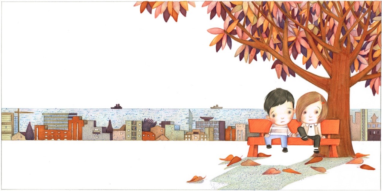 أضافت غروسمان إلى النّص تقنية رسم مميزة، وهي الحوار بين الألوان؛ فالألوان الباردة (الزرقاء) تميل إلى "الانتقال إلى الخلفية" ولمسات الألوان الدافئة (بالذات الأحمر) تميل إلى "المضي قدما" في عين الناظر. لهذا نجد الشجرة والمقعد والعنوان باللون الأحمر. هذه الألوان والحوار بينها، جاء ليذكر المشاهدين في كل وقت أن القصة هي عبارة عن حوار مستمر بين الأشياء، بين ندي ومي، وبين نقطة ونقيطة وبين النص والرسومات.