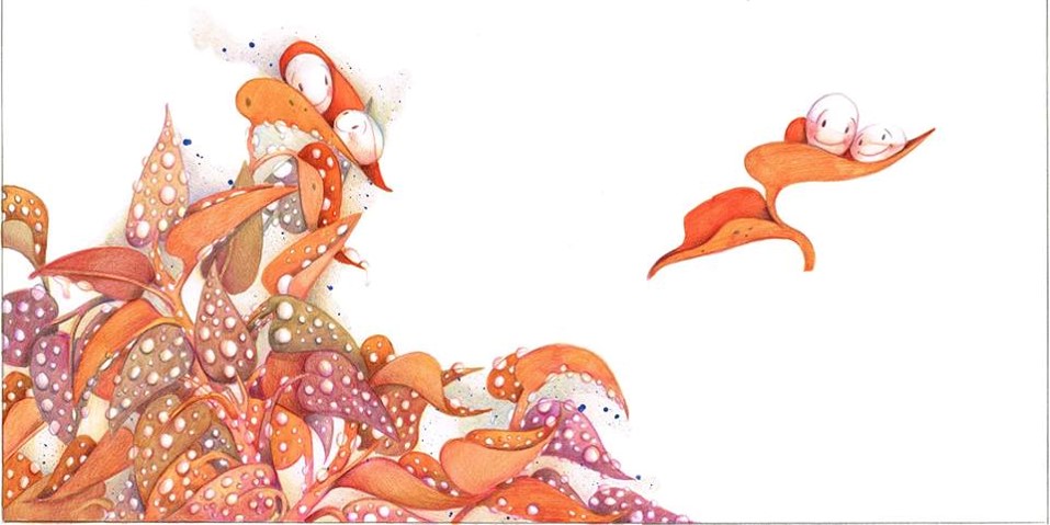 هذا الحوار بين الألوان، ربما يكون شفافًا لعينيّ الطفل في البداية، إلا أن تأثيره كبير على فهم النص وفهم ديالكتيكيته حتى بشكل باطني وغير واعٍ. يمكننا متابعة هذه التقنية بشكل واضح في الفصل الثاني في الكتاب، إذ تحكي لنا غروسمان قصصًا مختلفة في الرسومات، إلا أنّ اللون الطاغي الذي يبدو وكأنه ثلاثي الأبعاد وأقرب إلى القارئ، هو لون ورقة الشجر الحمراء التي تحمل نقطة ونقيطة. هذه التقنية تضع النقطتين في مركز الصورة، رغم أن مكانها من الصفحة هو هامشي نسبيًا.