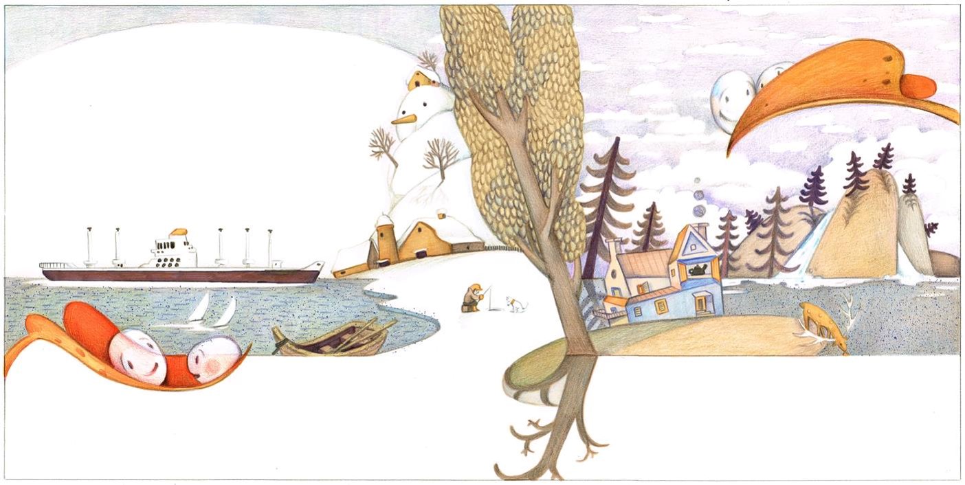 في الصفحتين الرابعة والخامسة نقطة تشجع نقيطة وتحكي لها عن دور المياه وأهميتها، وغروسمان تواصل استخدام الرسم بتقنية النّص الدوري، ولكن ليس بشكلٍ تام ومطلق حيث تضيف قاطعًا في مركز الرسمة ليفصل بين طرفي الصفحة. في الصفحة الرابعة، تظهر شجرة على طول الكتاب، وتفصل الجانب الأيمن عن الأيسر، وتعرض مظهرين مختلفين للطقس، الأول ماطر والثاني ثلجي، ولا يمكن أن يظهرا في نفس الوقت. قد يمثّل هذه القاطع بصورة شجرة فصل بين فترتين زمنيّتين مختلفتين، ولكن البيوت المرسومة في كل طرف من الصفحة يشير إلى معمارية مختلفة، ولذلك فمن المنطقي أن الفصل هو أيضا فصل جغرافي.