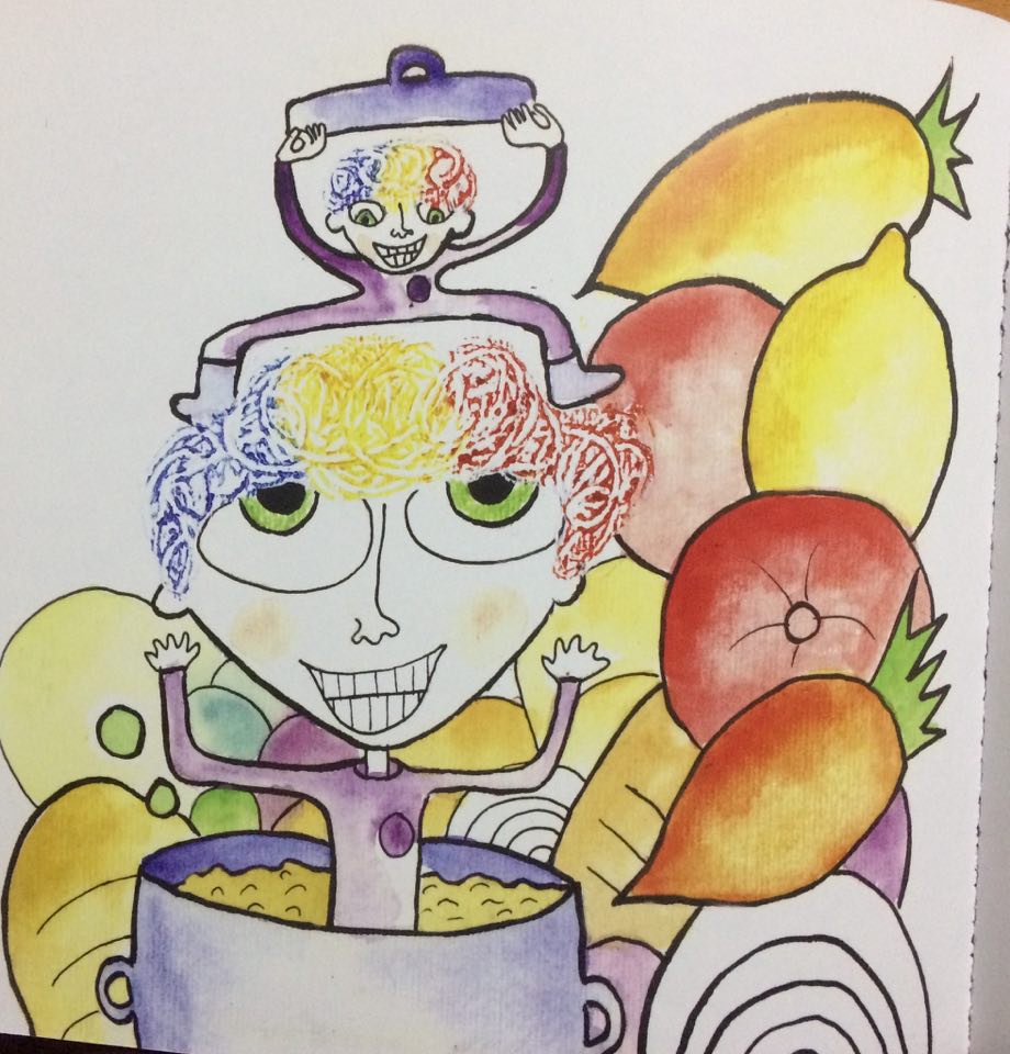 في الرسمة المقابلة نرى الطفل الراوي وصديقه بشعر ملوّن، يقف أحدهما على رأس الآخر، وكلاهما في داخل طنجرة وغطاها فوق رؤوسهم. حتى ملابسهما تحولّت إلى ملابس كائنات فضائيّة كما نشاهدها في الأفلام.